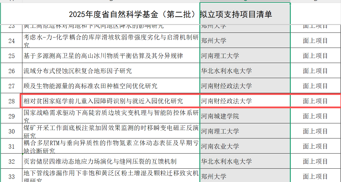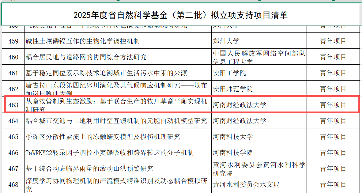 11月4日,河南省2025年度省自然科学基金项目拟立项清单公布,我院科研再传捷报:牛宁老师主持的《相对贫困家庭学前儿童入园障碍识别与就近入园优化研究》获面上项目立项,褚力其老师主持的《从畜牧管制到生态激励:基于联合生产的牧户草畜平衡实现机制研究》获青年项目立项,彰显我院基础研究实力。